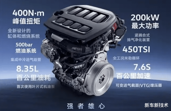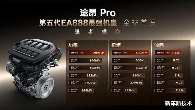 从技术角度来看,第五代EA888堪称地表最强,新引擎在进气、燃油喷射、油气混合、燃烧做功及排放控制等关键环节实现了全面革新。可变截面涡轮增压器(VTG)的加入,使得发动机在低转速下就能迅速爆发强劲动力,最大功率达到252马力,最大扭矩400牛·米,百公里加速仅需7.6秒。而500bar超高压燃油系统的运用,则进一步提升了燃油的雾化效果,油气混合几乎完全燃烧,在保证动力性的前提下最大化燃烧完全度并控制排放,排放物远远低于国六法规的限值。第五代EA888带来更强动力的同时,能耗还相比同级产品降低了10%,首搭车型途昂Pro的WLTC工况油耗下探至8.35L/100km的出色水平。因此,在中国内燃机工业协会内燃机产品能效评估中,第五代EA888发动机被评为“1级能效产品”。概括来说,第五代EA888变强了,也更省更静了,燃油车用户无须在驾驶乐趣与用车成本间做出妥协。
